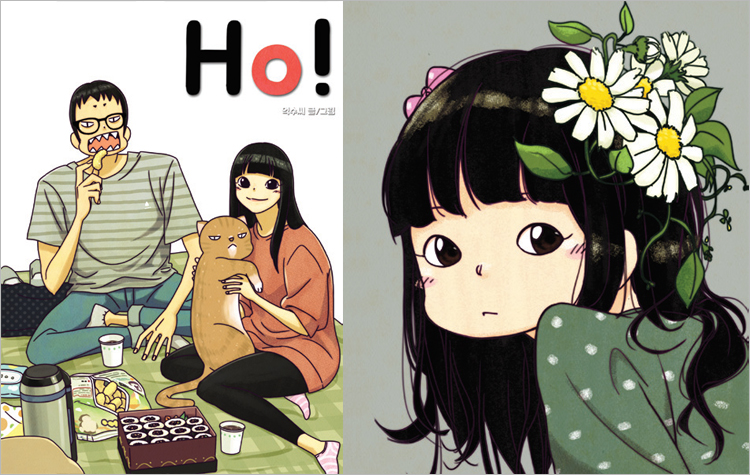 Ho ! du 25 octobre 2014 au 29 aout 2015 Il s’agit d’une romance entre Ho, une deficiente auditive, et Won, un gros coince au coeur pur. Malgre cela, cette romance a un caractere etrange. Pleine de pudeur et touchante, cette histoire jouit a present d’une grande popularite : il s’agit d’une oeuvre importante dans le genre des feel-good webtoons. *Laureat de l’edition 2015 du prix Oneuloei Woori Manhwa