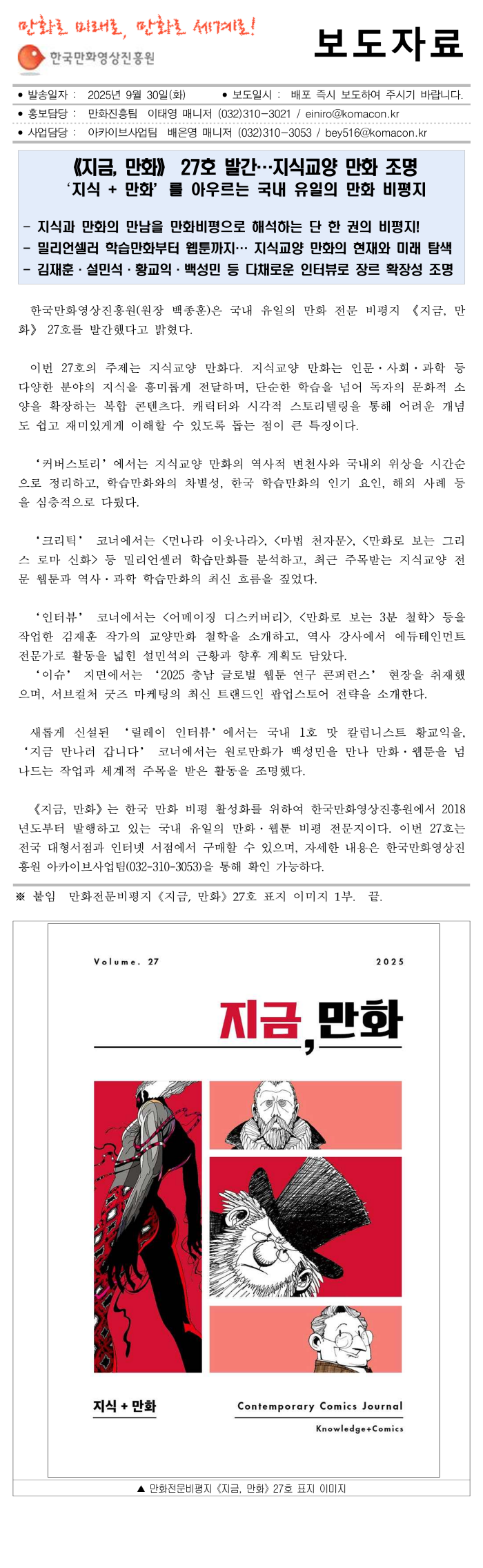 《지금, 만화》 27호 발간…지식교양 만화 조명
