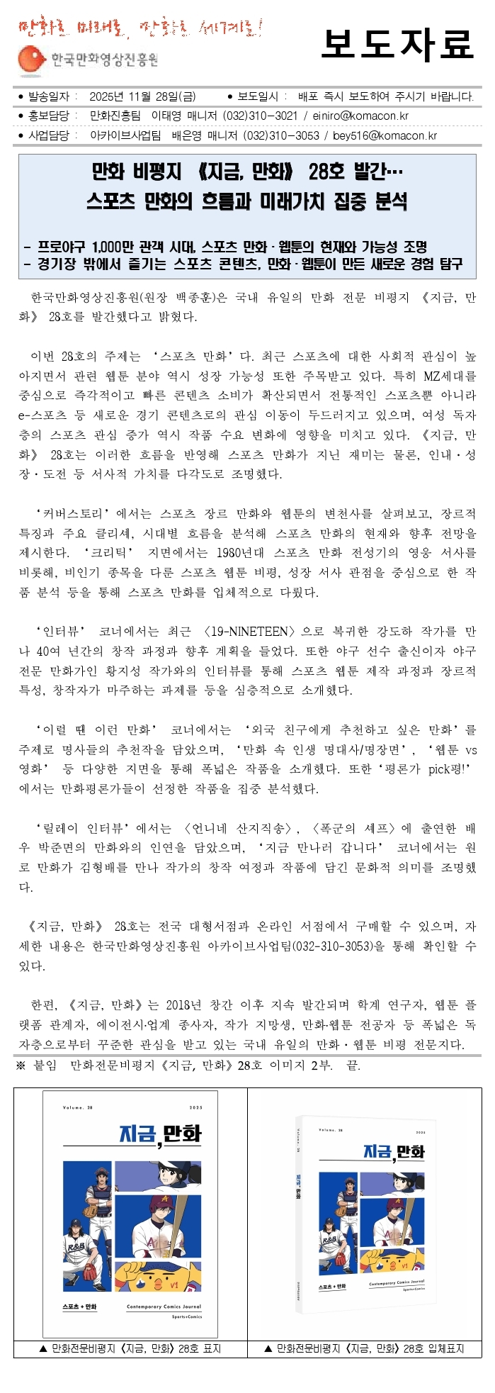 만화 전문 비평지 《지금, 만화》 28호 발간… 스포츠 만화의 흐름과 확장 가능성 조명
