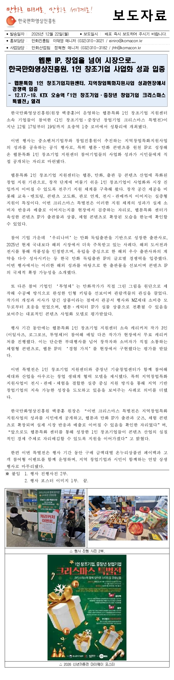 251216[보도자료]웹툰 IP, 창업을 넘어 시장으로... 한국만화영상진흥원, 1인 창조기업 사업화 성과 입증_최종.hwp