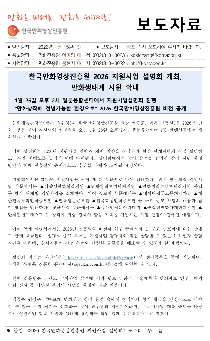 한국만화영상진흥원 2026 지원사업 설명회 개최 만화생태계 지원 확대