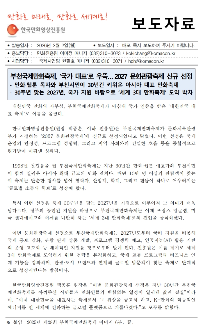 부천국제만화축제, ‘국가 대표’로 우뚝… 2027 문화관광축제 신규 선정