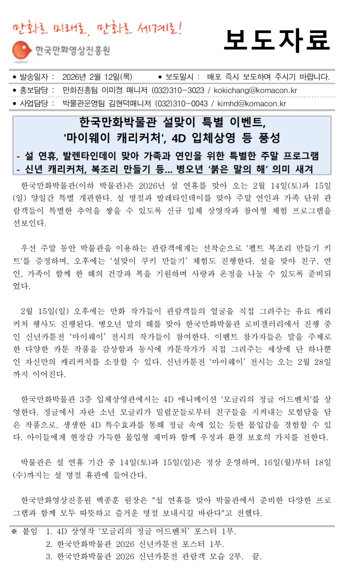 한국만화박물관, 설맞이 '마이웨이 캐리커처', 입체상영 등 특별 이벤트 개최