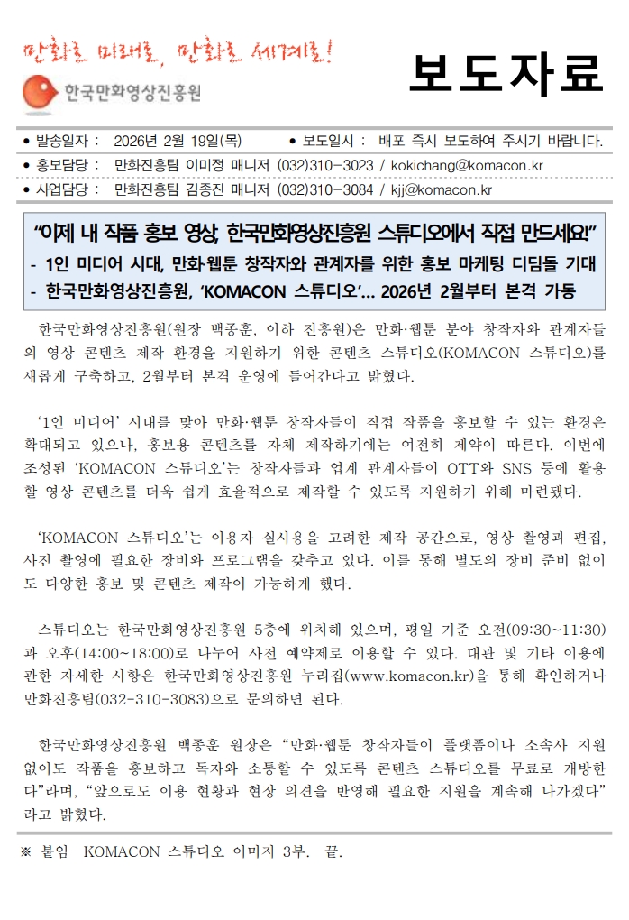 이제 내 작품 홍보 영상, 한국만화영상진흥원 스튜디오에서 직접 만드세요