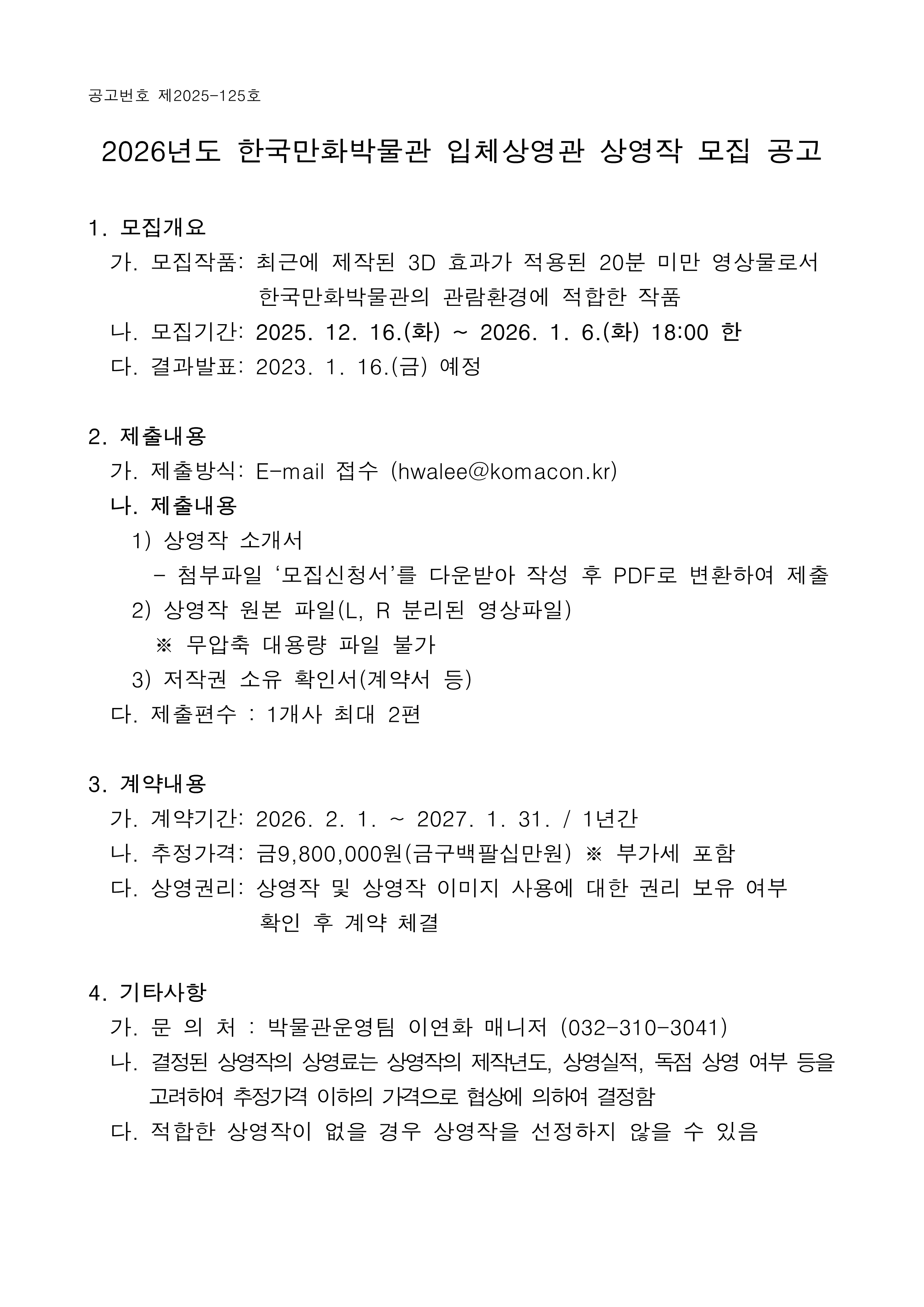 2026년도 한국만화박물관 입체상영관 상영작 모집 공고
