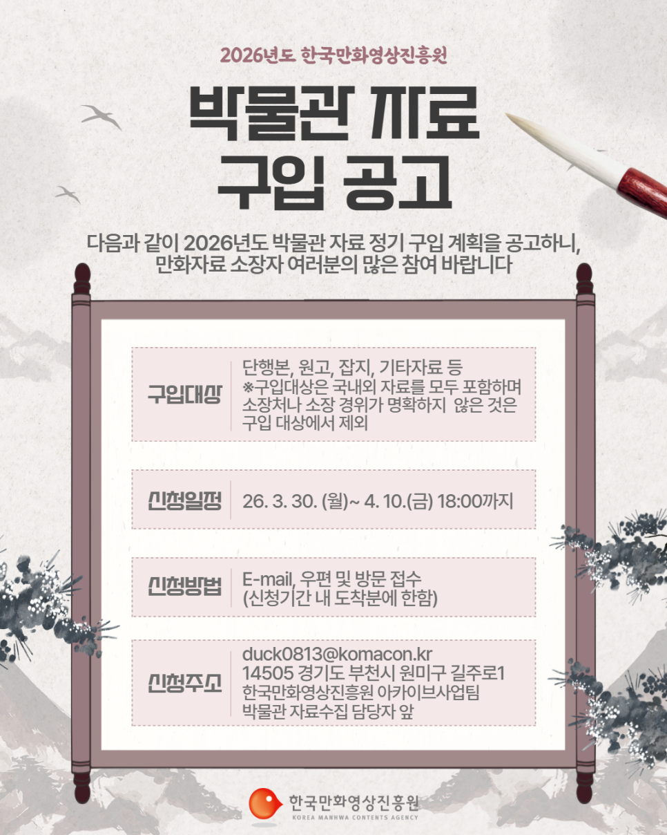 📌접수처 | 한국만화영상진흥원 만화산업팀 이연화 매니저(hwalee@komacon.kr)
