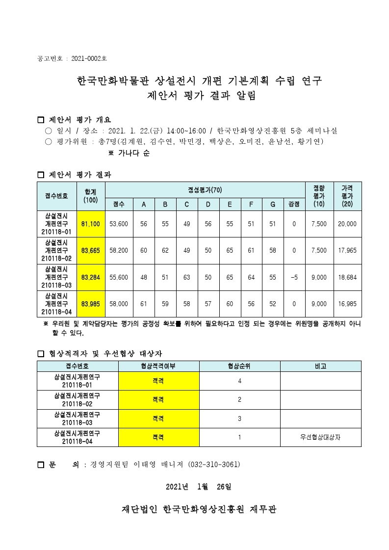 한국만화박물관 상설전시 개편 기본계획 수립 연구 제안서 평가 결과 알림