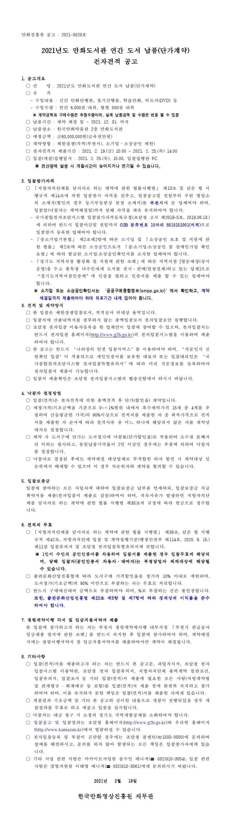 (취소공고)2021년도 만화도서관 연간 도서 납품(단가계약) 전자견적 공고