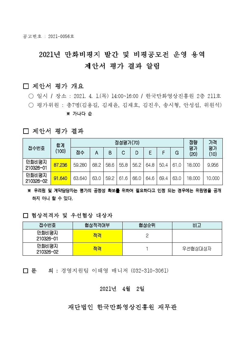 2021년 만화비평지 발간 및 비평공모전 운영 용역 제안서 평가 결과 알림