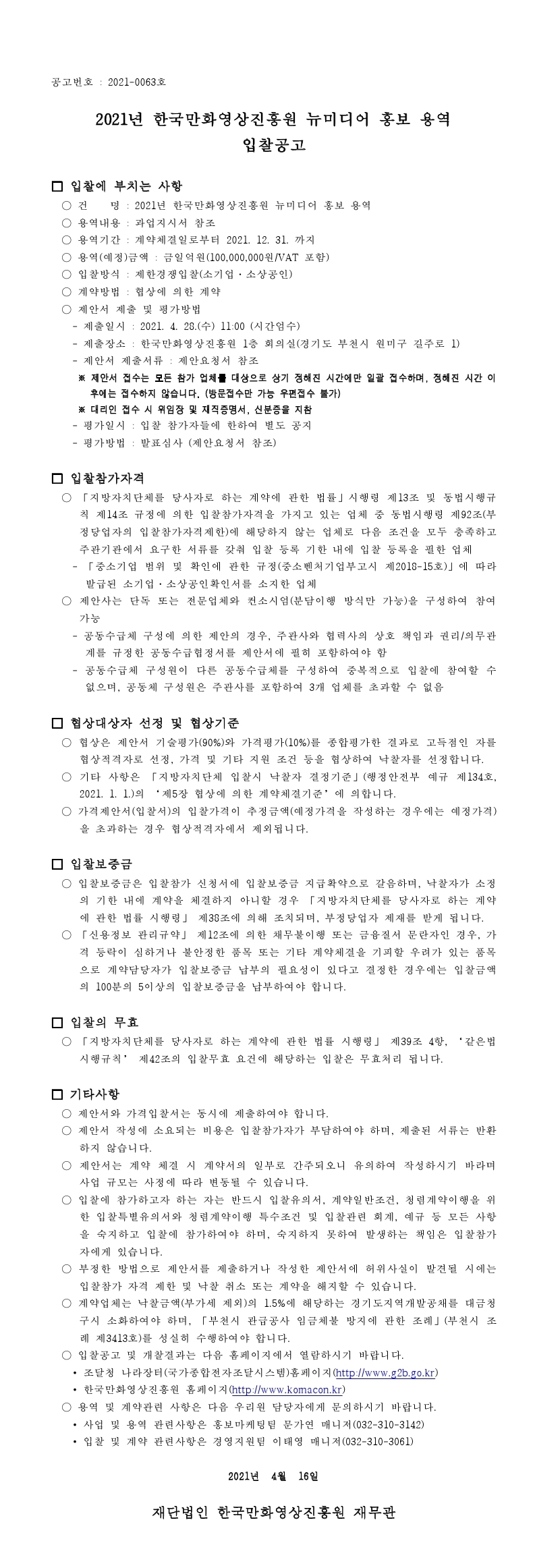 2021년 한국만화영상진흥원 뉴미디어 홍보 용역 입찰공고