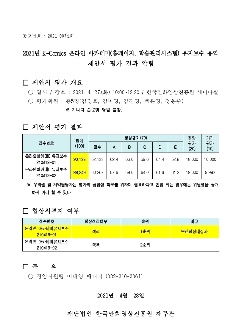 2021년 K-Comics 온라인 아카데미(홈페이지, 학습관리시스템) 유지보수 용역 제안서 평가 결과 알림
