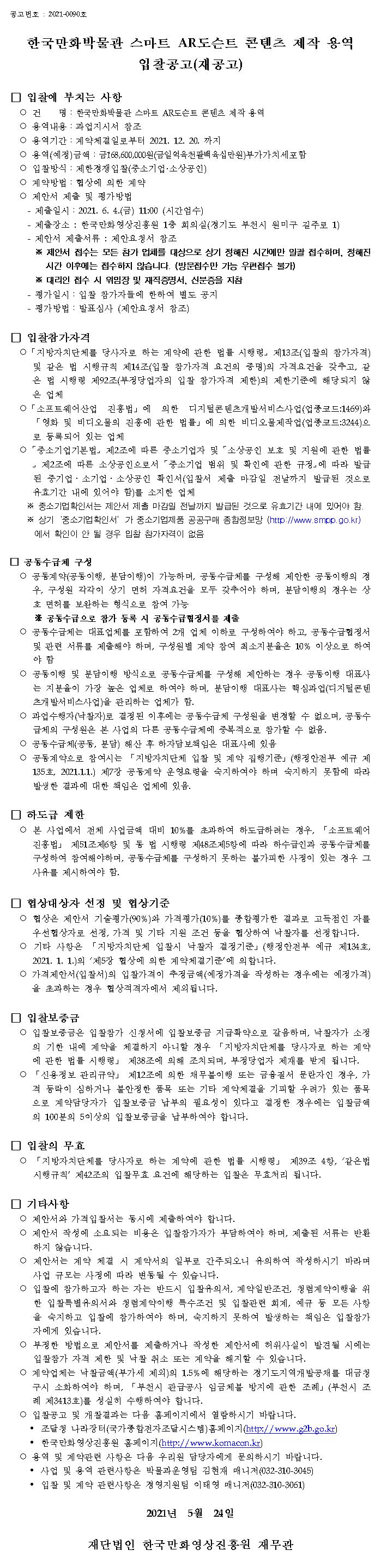 (긴급공고)한국만화박물관 스마트 AR도슨트 콘텐츠 제작 용역 입찰공고(재공고)
