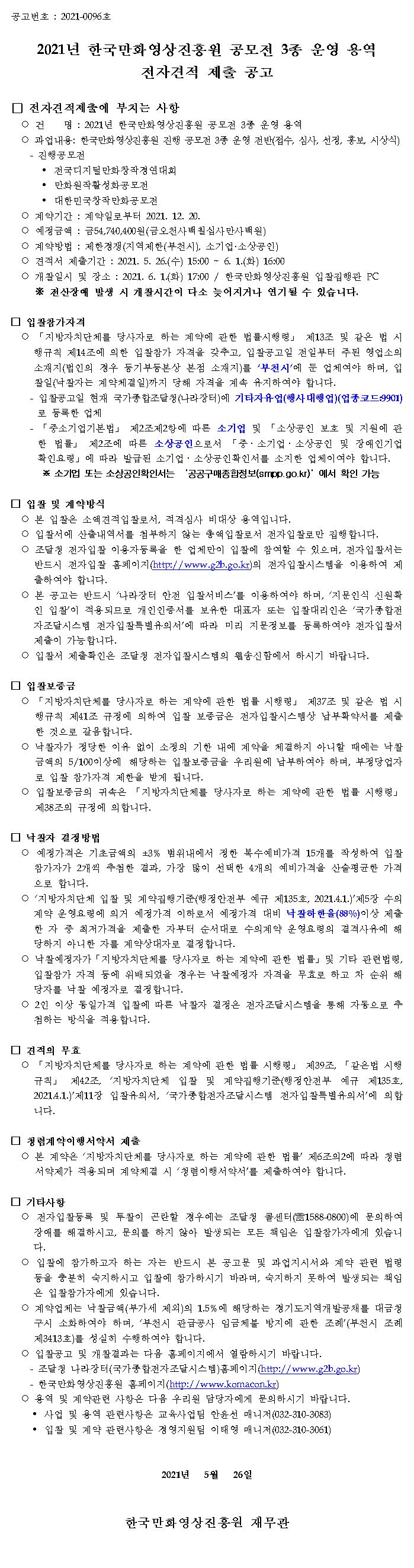2021년 한국만화영상진흥원 공모전 3종 운영 용역 전자견적 제출 공고