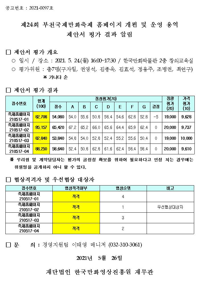 제24회 부천국제만화축제 홈페이지 개편 및 운영 용역 제안서 평가 결과 알림