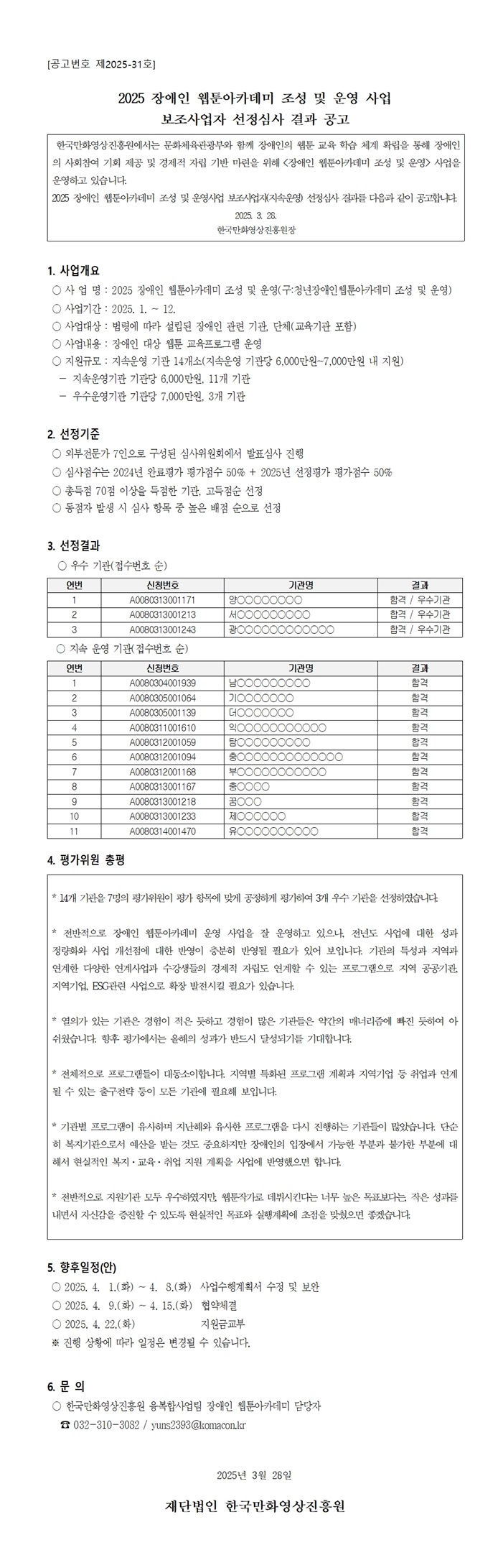 2025 장애인 웹툰아카데미 조성 및 운영 사업 보조사업자 선정심사 결과 공고