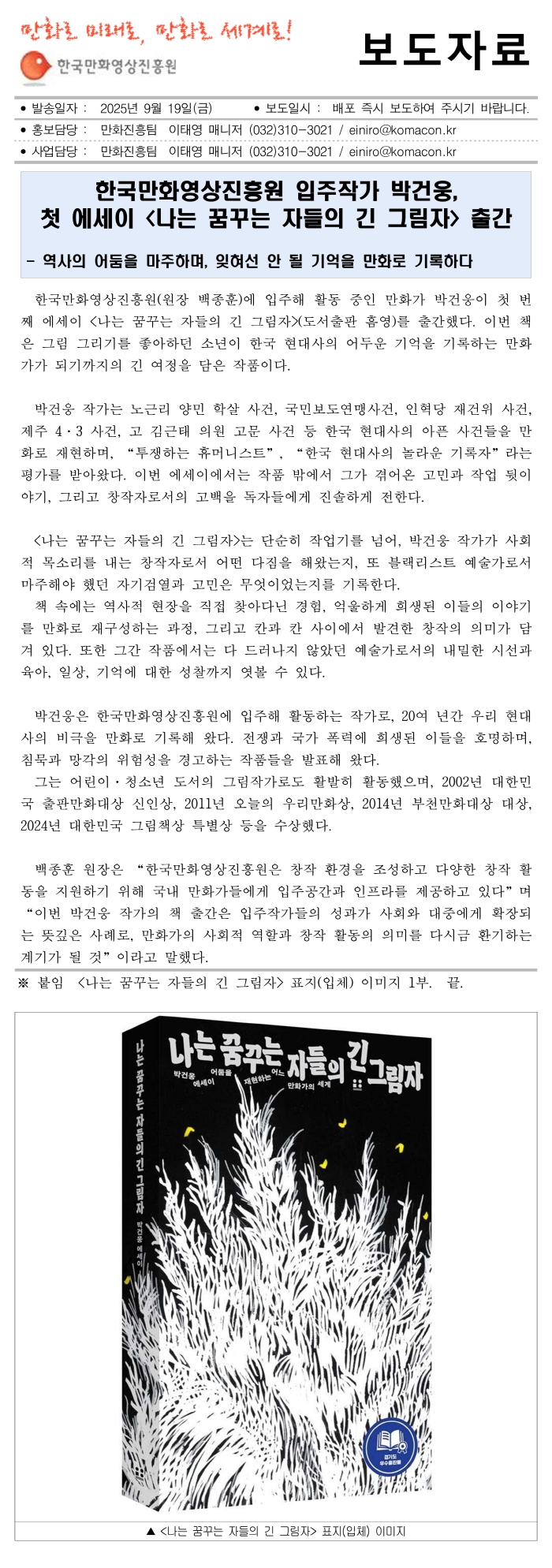 국만화영상진흥원 입주작가 박건웅, 첫 에세이 『나는 꿈꾸는 자들의 긴 그림자』 출간