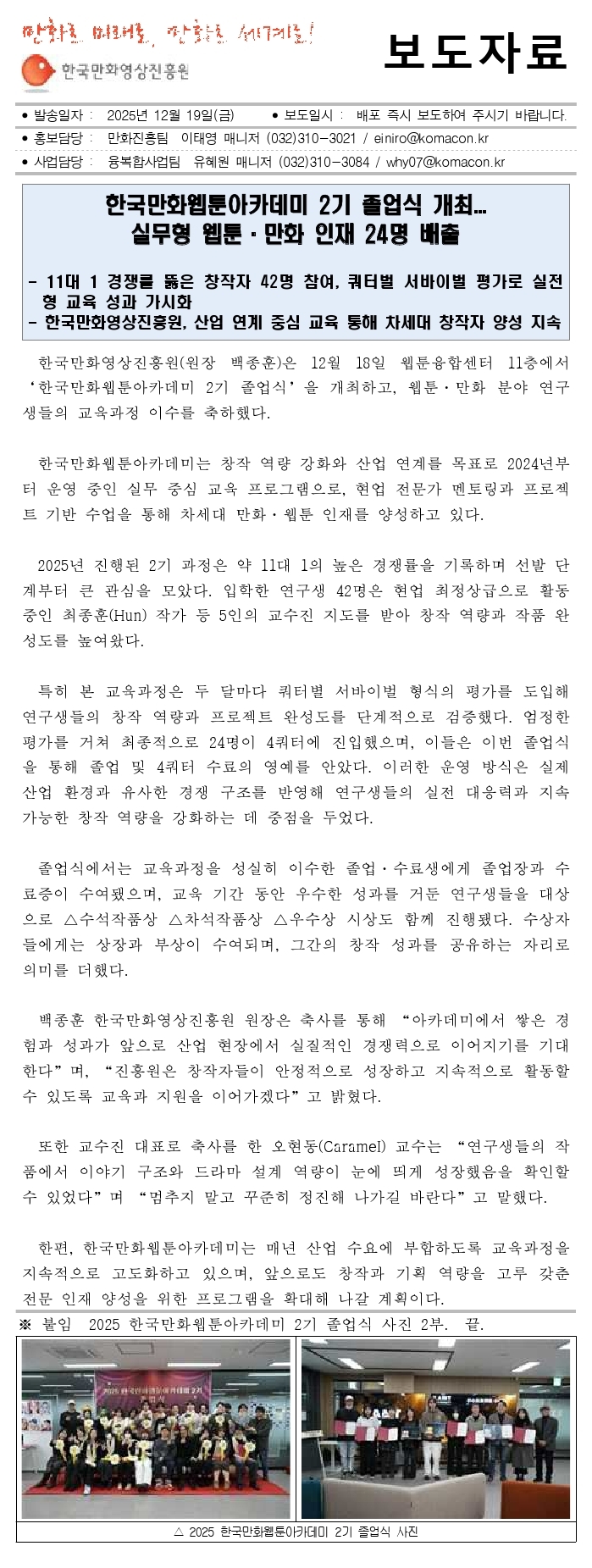 251218[보도자료]한국만화웹툰아카데미 2기 졸업식 개최...실무형 웹툰·만화 인재 24명 배출_최종.hwp