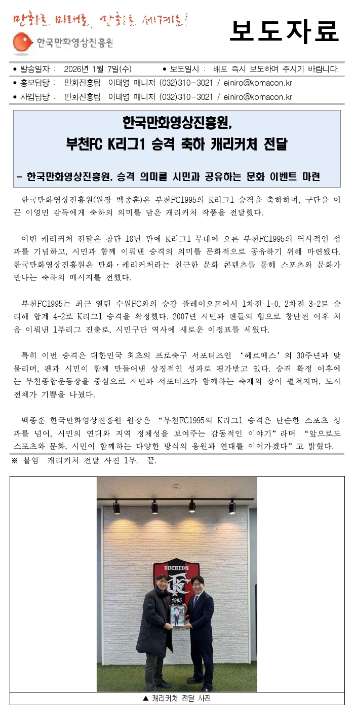 260106[보도자료]한국만화영상진흥원, 부천FC K리그1 승격 축하 캐리커처 전달_최종.hwp