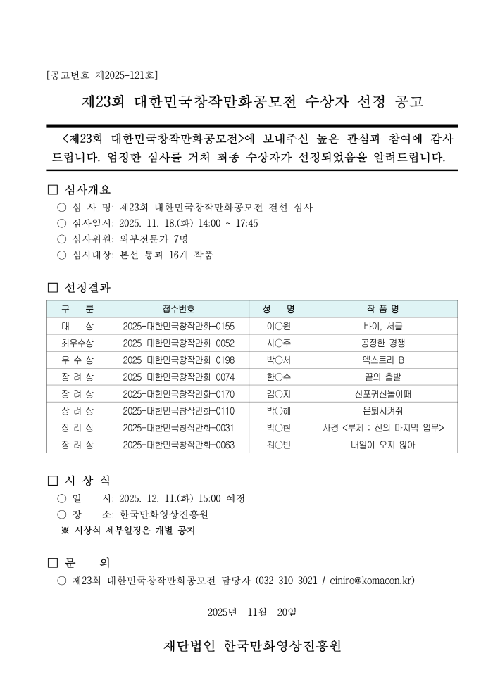 제23회 대한민국창작만화공모전 수상자 선정 공고
