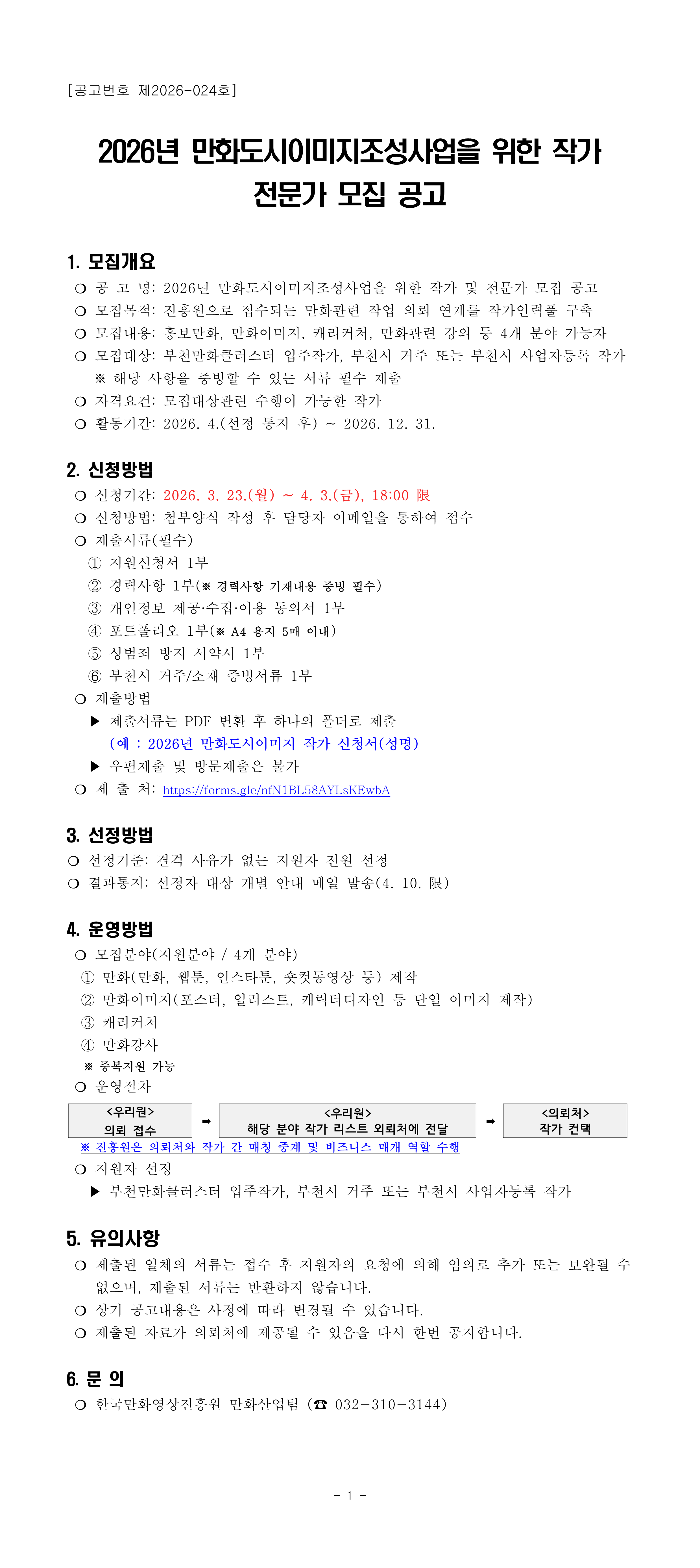 2026년 만화도시이미지조성사업을 위한 작가 전문가 모집 공고