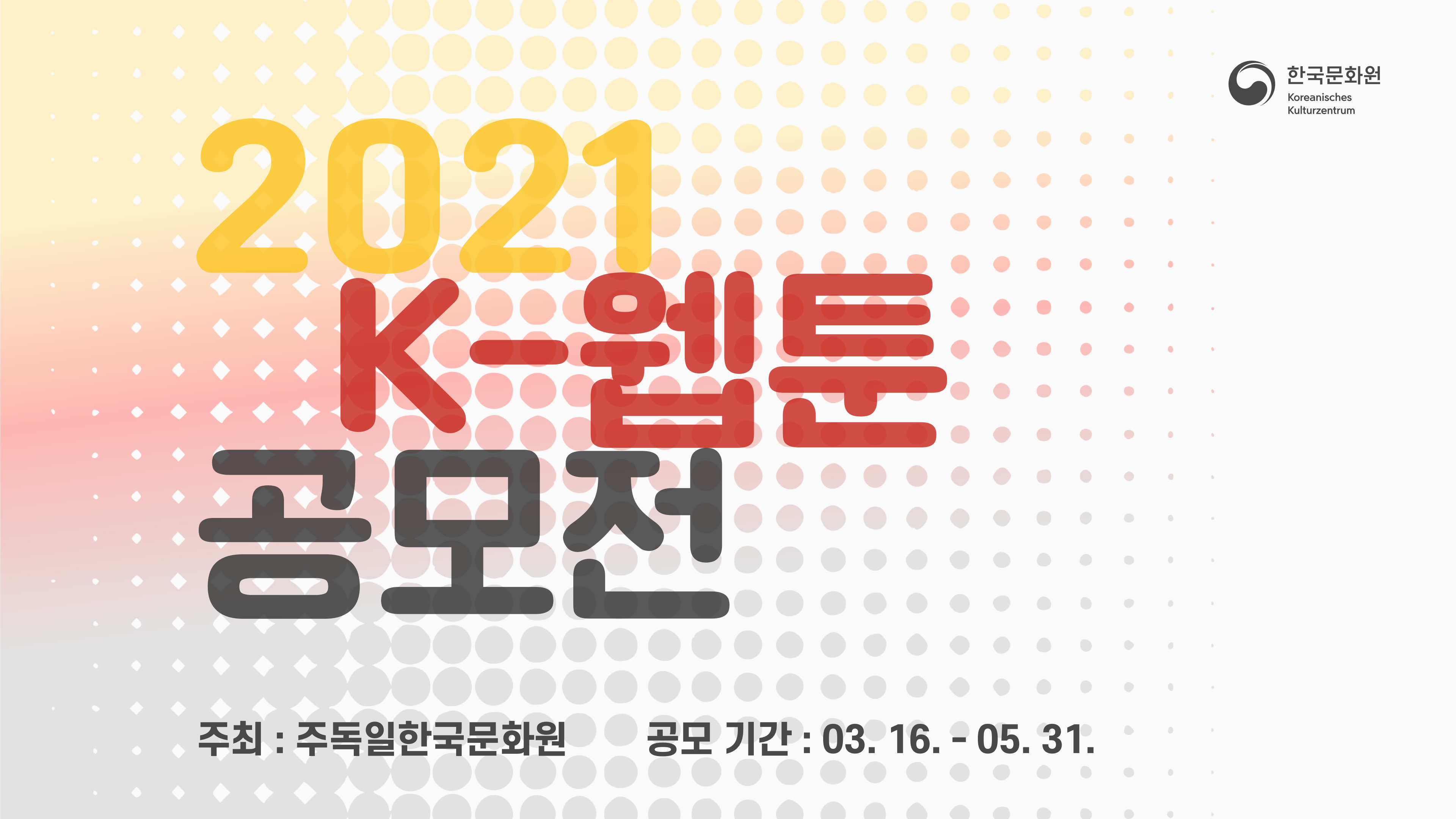 주독일한국문화원은 독일 내 K-웹툰의 우수성을 홍보하고자 ‘2021 K-웹툰 공모전’을 다음과 같이 실시하오니 역량 있는 분들의 많은 참여를 바랍니다.