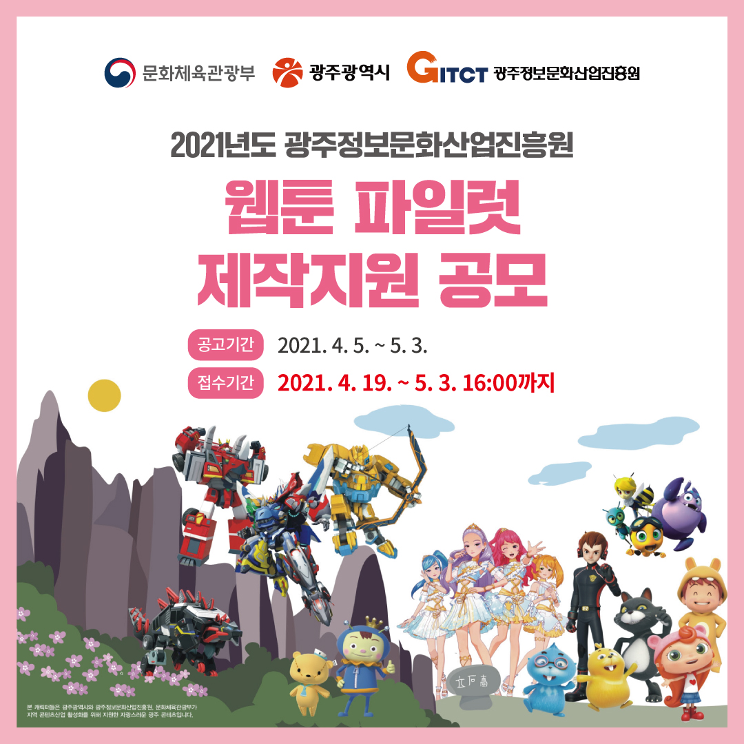 (재)광주정보문화산업진흥원은 광주광역시, 문화체육관광부와 함께 아시아문화중심도시 광주 웹툰작가들의 웹툰 제작지원을 위해 ‘2021 웹툰 파일럿 제작지원사업’을 아래와 같이 시행하오니 많은 관심과 참여 바랍니다.