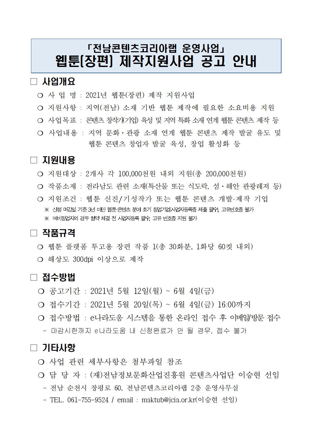 [붙임1] 2021년 전남콘텐츠코리아랩 웹툰(장편) 제작지원 사업 공고계획(안).hwp