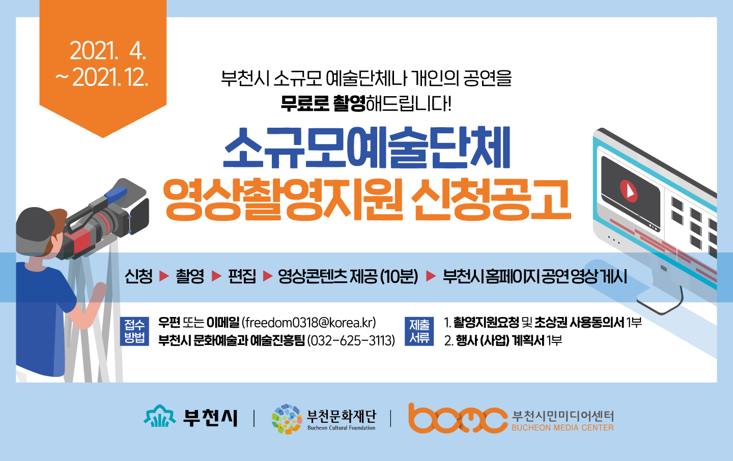 < 코로나19 - 소규모예술단체 영상촬영 지원 신청 안내 > 1. 신청자격 가. 공고일 현재 부천시에서 문화예술활동을 하는 소규모 예술단체나 개인 (행사장소 : 부천시 관내 限) 나. 별도 촬영 예산이 있거나 2,000만 원 이상 사업 제외 (제외행사 : 종교, 영리목적 행사, 미풍양속에 어긋나는 행사 등) 2. 접수기간 : 2021. 4. ~ 2021. 12. 3. 접수방법 : 우편 또는 이메일 가. 우편 접수 : 부천시 소향로181, 상가동 2층 문화예술과(중동, 센트럴파크 푸르지오) 나. 이메일 접수 : freedom0318@korea.kr 4. 제출서류 가. 촬영지원요청 및 초상권사용 동의서 1부. 나. 행사(사업)계획서 1부. 5. 지원결정 및 통지 : 수시 개별 통보 6. 문 의 : 부천시 문화예술과 (☎ 032-625-3113) |