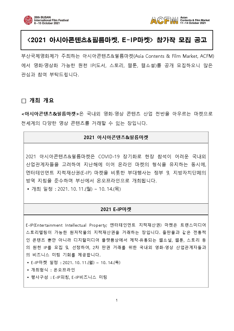 [부산국제영화제] 2021 아시아콘텐츠&필름마켓, E-IP마켓 참가작 모집 공고