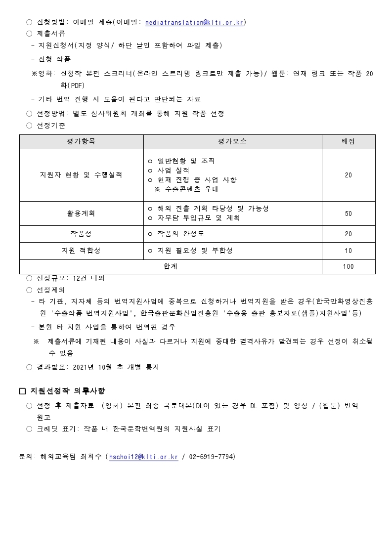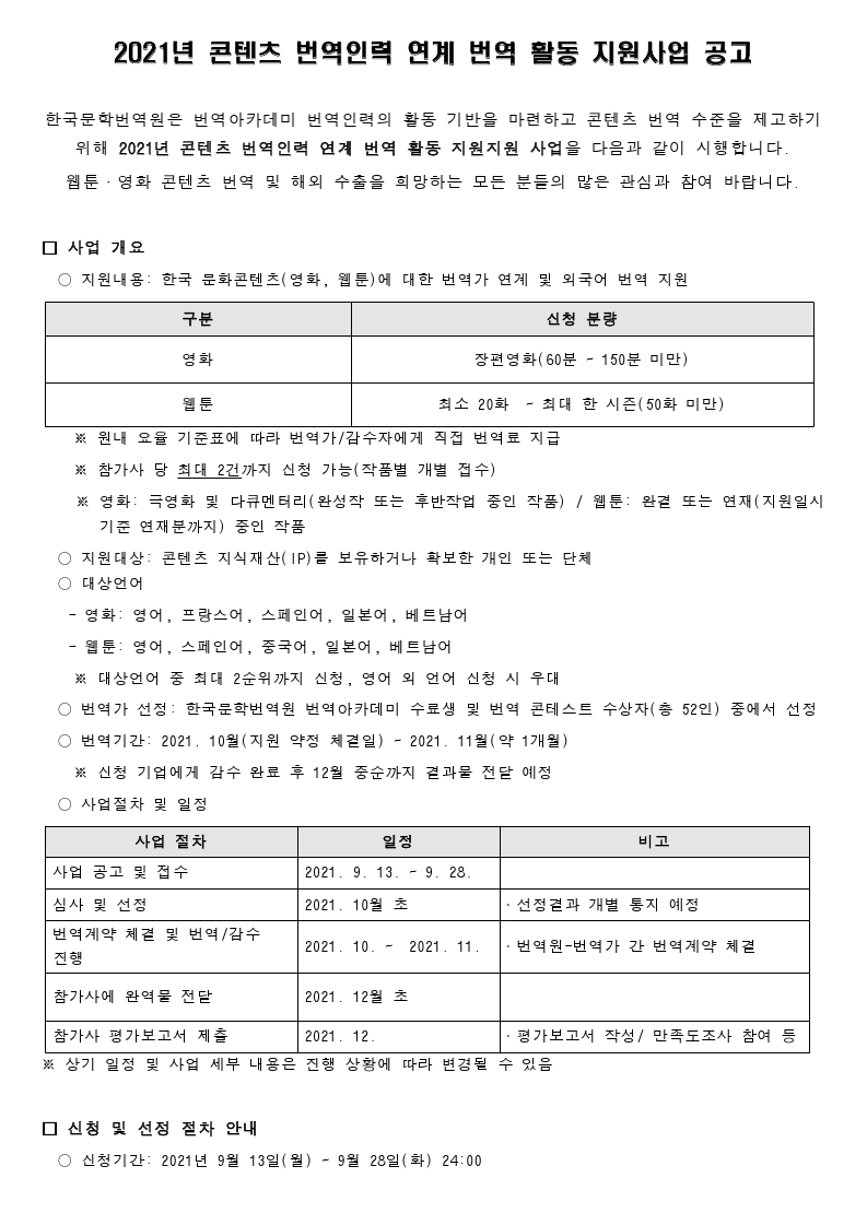 [한국문학번역원] 2021 콘텐츠 번역인력 연계 번역활동 지원사업 공고