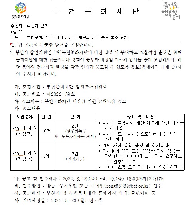 [부천문화재단] 비상임 임원 공개모집 공고 홍보