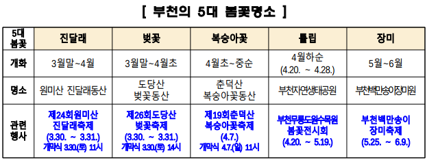 - 내 용: 수도권 최고의 봄꽃관광도시 브랜딩을 위한 부천의 5대 봄꽃 및 주요 관람명소 연계 집중 방문기간 운영