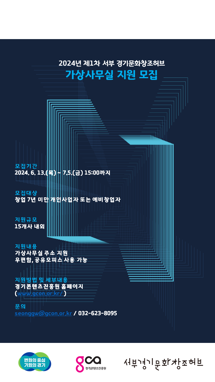 [경기콘텐츠진흥원] 2024 제1차 서부 경기문화창조허브 가상사무실 지원 모집(~7.5.)