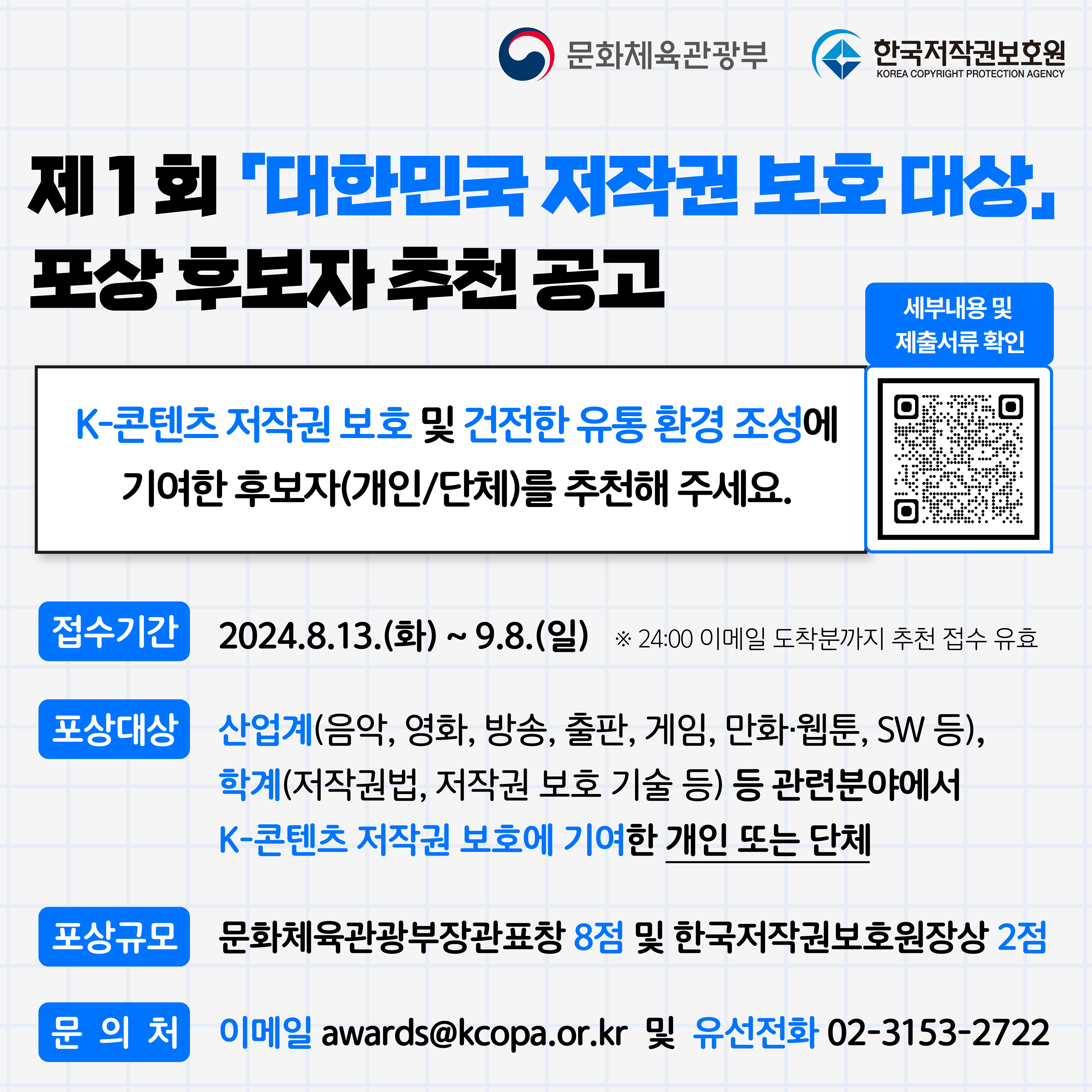 [한국저작권보호원] 제1회 대한민국 저작권 보호 대상 포상 후보자 추천 공고(~9.8.)