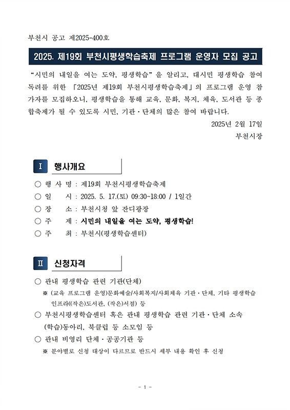 [부천시] 제19회 부천시평생학습축제 프로그램 운영자 모집