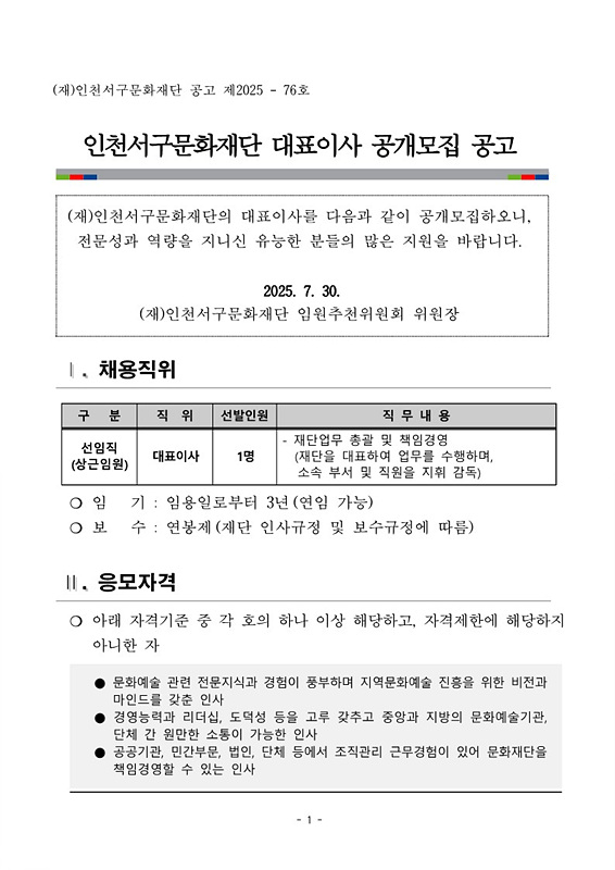 [인천서구문화재단] 인천서구문화재단 대표이사 공개모집 공고