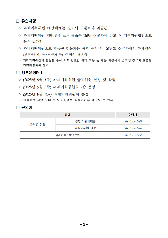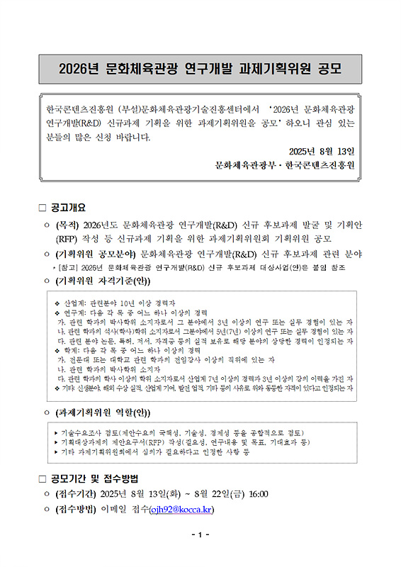 [한국콘텐츠진흥원] 2026 문화체육관광 연구개발(R&D) 과제기획위원 공모 협조 요청