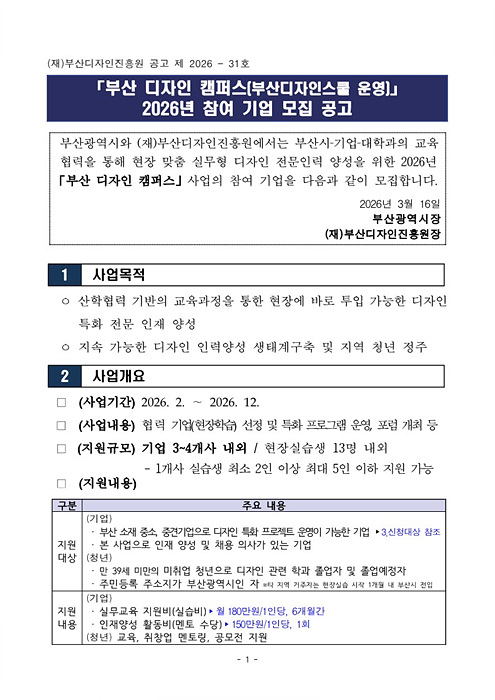[부산디자인진흥원] 2026년 부산 디자인 캠퍼스(부산디자인스쿨 운영) 참여기업 모집